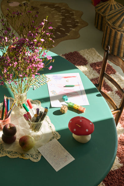 En svampe-sparebøsse står på bordet til små mønter. På bordet ligger også en stor terning i træ og et robot highlighter sæt. Flere farver, tuscher og farveblyanter opbevares i smukke glas fra Akua, som Annika, mor til Alban og Noam, er medstifter af.