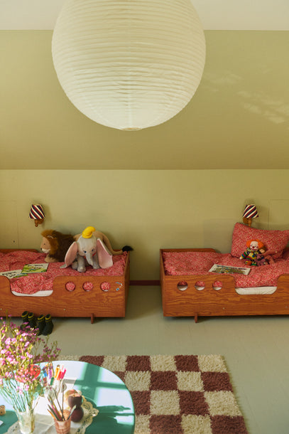 Alban og Noams senge er fra Baby Love, og derefter malet med Satin Wood Oil fra Linolie i farven 'Pompeji'. På gulvet foran den ene seng står to par hjemmesko i uld - et par til hver.