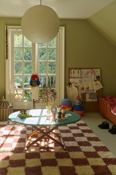 Et lavt rundt bord, som er købt vintage og malet med farven 'Vardo' fra Farrow & Ball, står i midten af værelset, og samler både rummet og drengene: Her er der plads til alle deres kreative udfoldelser, men også plads til leg og spil.