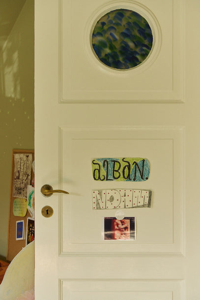 Her bor Alban og Noam: Håndskrevne navneskilte og et enkelt scanningsbillede hænger fint på døren til værelset. Udenpå er døren hvid – på den anden side er døren malet i samme farve som paneler og radiatorskjuler.