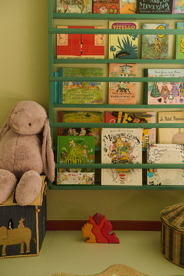 Her ses også bøgerne Tante Grøn, Tante Brun og Tante Lilla, Puttes Eventyr i Blåbærskoven og De Små Skovnisser. Et sæt 'Casa Glora' klodser står på gulvet.