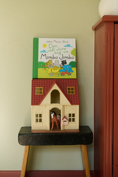 'Den vildt store bog om Mimbo Jimbo' skrevet af Jakob Martin Strid og udgivet af Gyldendal, står ovenpå et legehus, der står på en fin, ældre skammel.