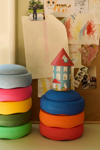 To tårne af farverige trædesten; det ene tårn med et Mumi Huskespil ovenpå. Bagved står en stor opslagstavle købt i XL Byg. Både Alban og Noam har deres egen opslagstavle, hvor de gemmer tegninger og billeder af familie og venner.