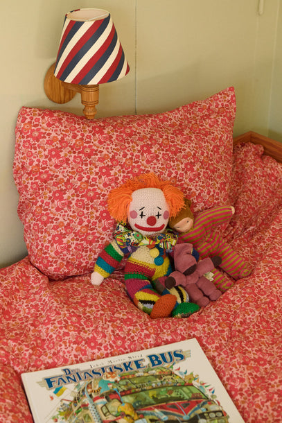 Den Fantastiske Bus, endnu en Jakob Martin Strid klassiker, ligger på en af sengene og ved siden af ligger en strikket klovn og en Pimpel dukke i farven solbær.