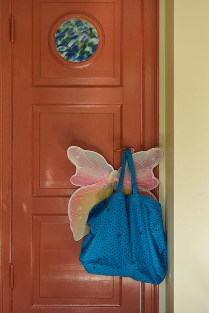 Det runde glas i døren er designet af Annika og derefter produceret efter mål. På håndtaget hænger sommerfuglevinger og en stor blå tote fra Bonton.