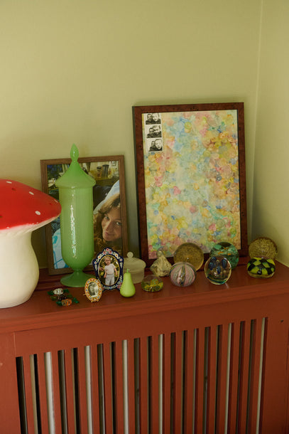 Annika rejser ofte med Akua til Italien, særligt Venedig hvor Akua producerer deres glas, vaser, skåle mm. Hver gang tager hun en brevvægt med tilbage til drengene – en tradition hun fører videre fra sin mormor, der altid gav en brevvægt til Annikas mor – og det er blevet til den fineste samling. Til venstre anes den store røde svampelampe, der tændes når drengene skal sove.