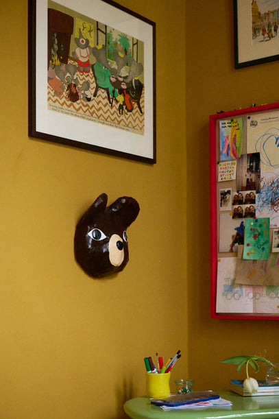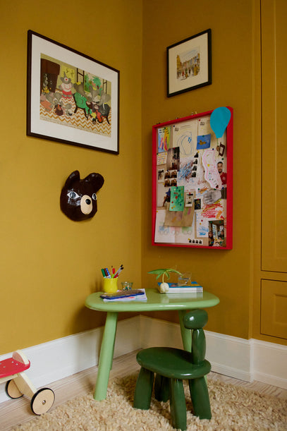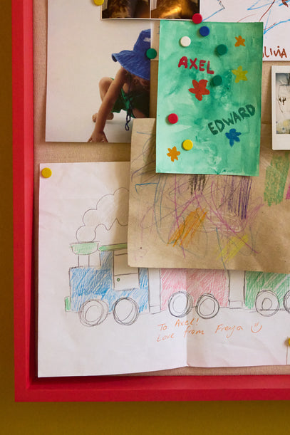 Personlige billeder og fine tegninger hænger på opslagstavlen, hvis smukke røde farve passer flot til de gule vægge.