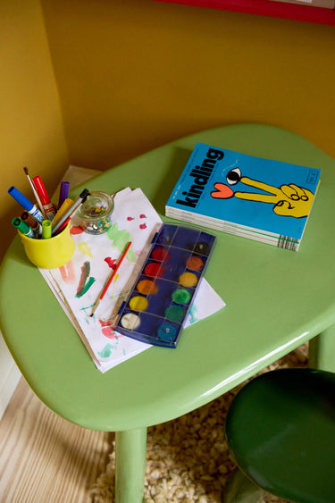 Smukke farver i Axels 'med-egne-ord' 'kontorhjørne' med de gule vægge, en mørkebrun bjørn, det grønne bord og den røde ramme fra opslagstavlen, som også fungerer som en lille hylde.