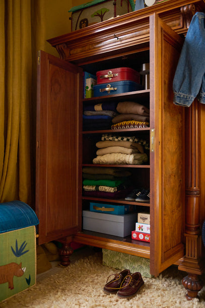 Et par af Axels loafers foran det gamle skab, som ellers er fyldt med strik, inklusiv en Studio Mini cashmere sweater, cardigans, sko til lidt mere festlige lejligheder – og hvad end Axel kan finde på at gemme af legetøj derinde.