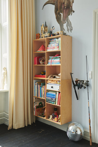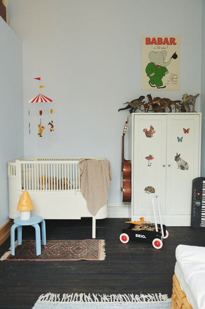 Balders seng, som er vintage, står langs væggen tæt på vinduet. På væggen hænger en papier-mache ræv, og en Charlie Chair i sky blue står ved siden af. Under vinduet står en raffia kurv som bruges til opbevaring af legetøj. Det blå tæppe på gulvet og puder i sengen er fra Aiayu.