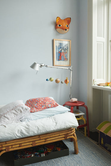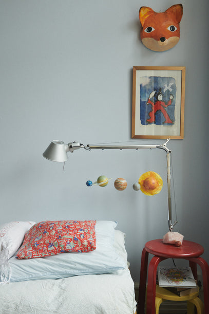En hjemmelavet uro hænger på Tolomeo lampen, mens en papier-mache ræv pynter på væggen.