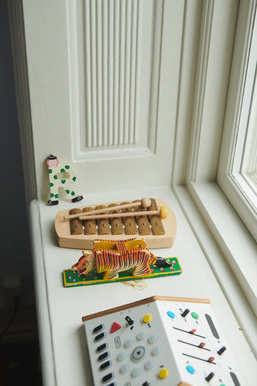 Grimms fødselsdagsring er placeret i vindueskarmen sammen med en figur fundet på et loppemarked.