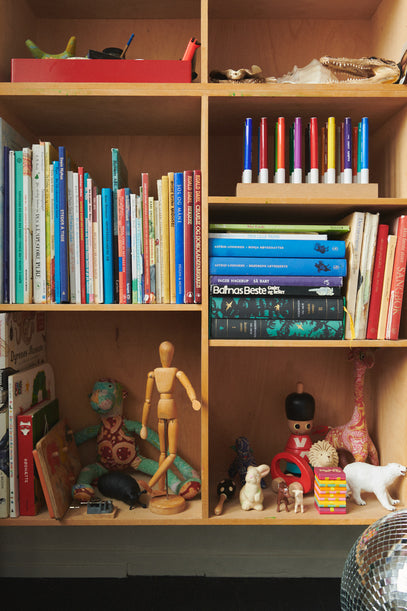 De to dansk-norske brødre Balder (7 år) og Robin (1 år), deler dette fine blå værelse. Her er der plads til både dinosaurer, fiskegrej, musikudstyr og Robins gåvogn.