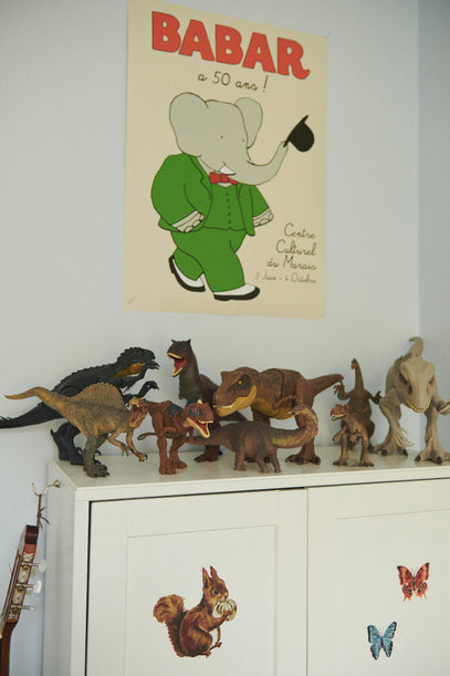 En stor samling dinosaurer har fået plads oven på skabet. Over dem hænger en Babar plakat.