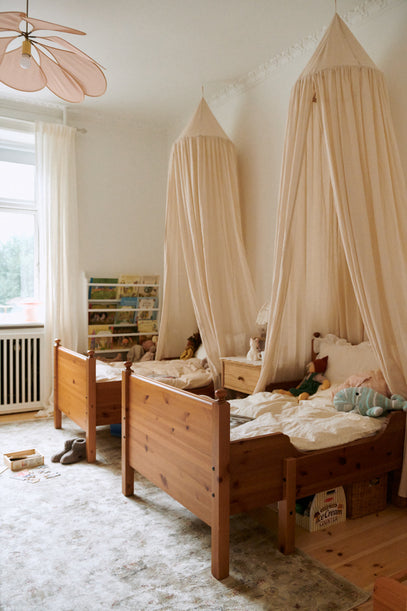 4-årige Ellie og 2-årige Cornelia deler et skønt værelse, der er indrettet med kærlighed til afdæmpede farver, varme materialer og med intentionen om at holde stemningen blød, rolig og varm.