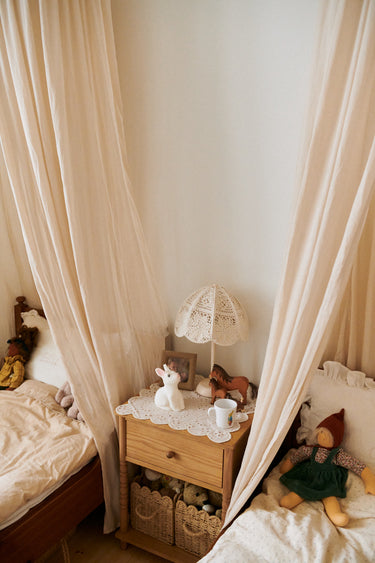 Ellie og Cornelia sover i ens senge, som er fundet brugt. Hver seng har sin egen sengehimmel, der skaber tryghed og ro. Her ses en blå, strikket hval, hjemmesko i uld og på natbordet mellem sengene står en sød kanin sparebøsse.