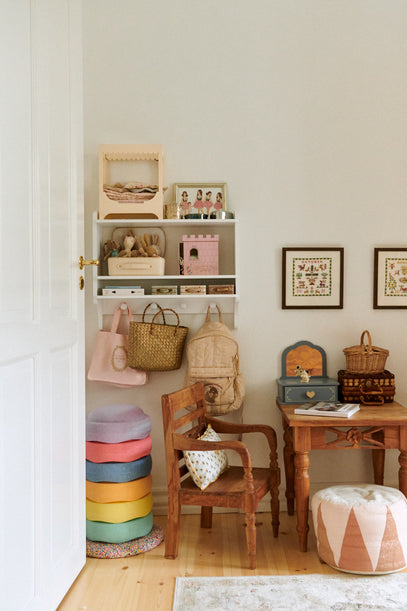 Modsat sengene står et vintage bord-og-stole-sæt i træ. Det er her Ellie og Cornelia tegner og leger. Bag stolen står et tårn af pastelfarvede trædesten fra Stapelstein, og en picnic kurv står på bordet.