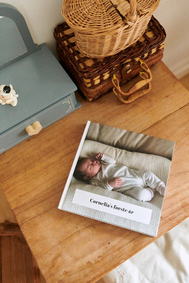 'Ellies første år' i printet format – en bog, hun kommer til at tage med sig gennem livet. På sengen ses også en blød kaninbamse samt en pude med broderet navn på.
