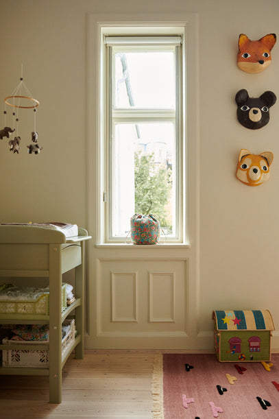 Et lyst og roligt hjørne på værelset med kig til puslepladsen og vinduet. I vindueskarmen står en Liberty Pouch, der bruges som pusletaske. På væggen hænger tre papier-mâché masker over hinanden, og under dem står en lille raffia kurv fra Rice med plads til legetøj.