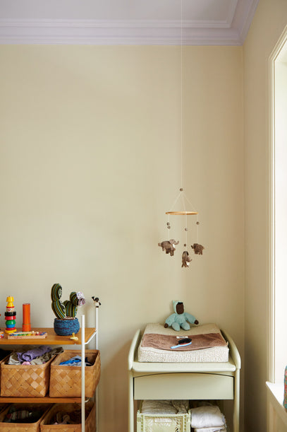 Francas tøj opbevares i bambuskurve i reolen, let tilgængeligt fra puslepladsen ved siden af. Øverst på reolen er der plads til alle Francas fine ting, herunder trælegetøj, en picnic kurv, en xylofon og en gul sut til når hun skal sove.