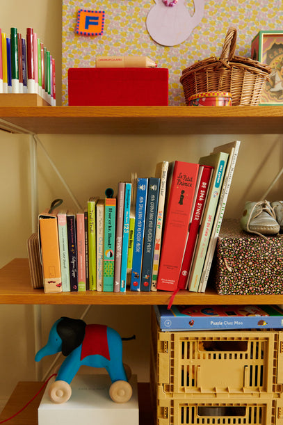 Et kig ind på reolen, der er fyldt med en masse skønne bøger, blandt andet Den Lille Prins i pop-up version. Bøgerne står side om side med Francas første par sko, tuscher og en skøn blå elefant fra Grimm's.