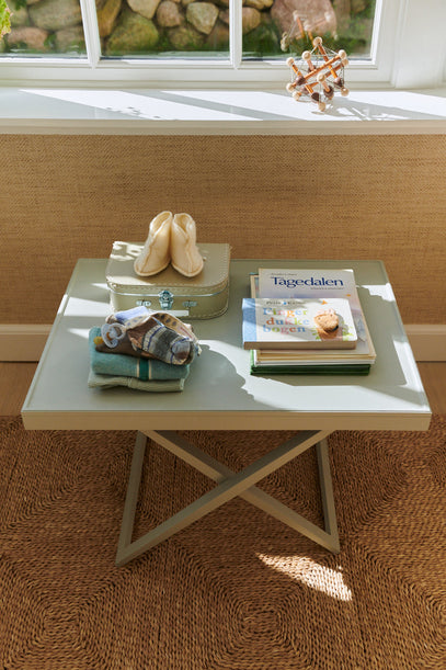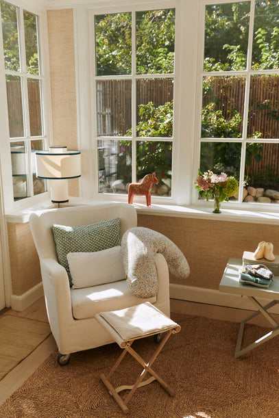 En lænestol er placeret ved vinduet og er et skønt sted at amme. Foran stolen står en foldbar taburet, også fra Oliver Furniture. Den bruges til at hvile fødderne på og også som et lille bord til eks. et blad eller en bog. 'Camp taburetten' er let at flytte rundt omkring i huset og kan foldes når den ikke er i brug.