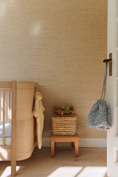 Nede i tremmesengen anes baby sengetøj fra Studio Mini. På døren hænger en Liberty pouch, og på den lille stol bagerst ligger en grøn Pimpel dukke og en baby rangle i træ.