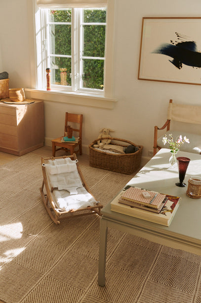 En rattan babyrangle og to sutter, en i farve mocha og en i farve sky blue passer naturligt ind i resten af det smukke interiør.