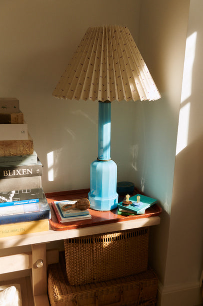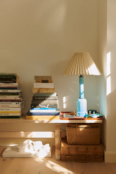 En bænk er placeret langs den ene væg i stuen og fungerer som en lav hylde. Her ligger mange bøger og under bænken står nogle kurve og en enkel skulptur. Den orange bakke og tyrkise lampe skaber en overraskende men utrolig smuk og harmonisk helhed.