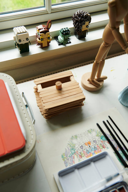 Et blik på skrivebordet: Her ses et sæt med fine vandfarver fra Creativ Company ved siden af en lille kasse, Gilbert engang lavede ud af ispinde, små LEGO figurer i vindueskarmen og en kuffert, der bruges til opbevaring.
