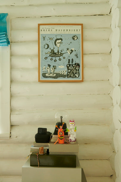 På væggen hænger en plakat købt på Henry Miller Memorial Library i Big Sur, Californien.