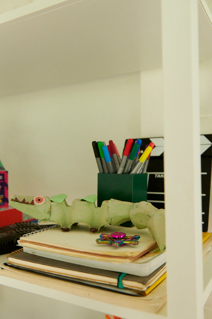 Tuscher fra Creativ Company står på hylden ved siden af en krokodille, lavet ud af æggebakker.