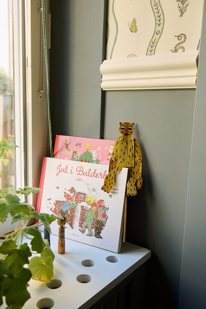 Leo elsker historier og at få læst højt. I karmen her står et par bøger, blandt andet "Jul i Bulderby" af Astrid Lindgren.