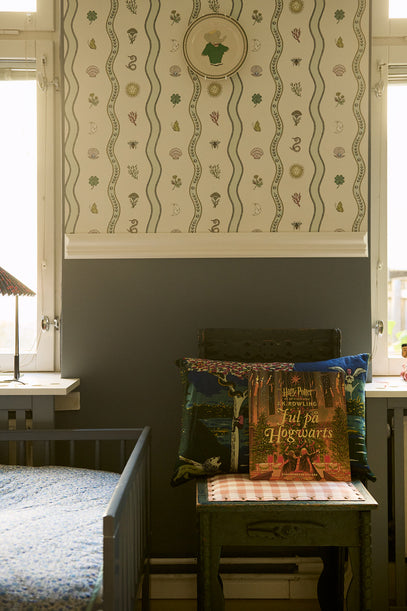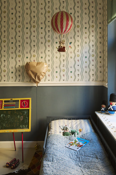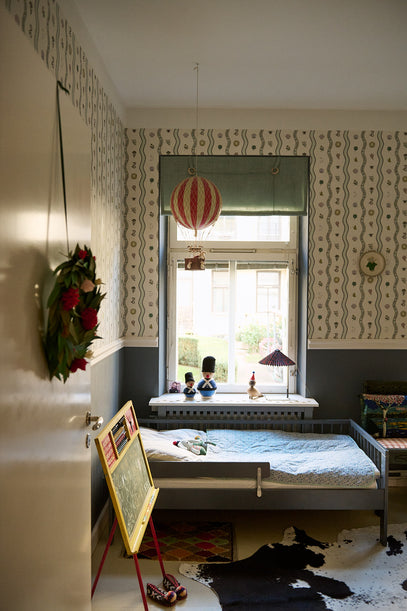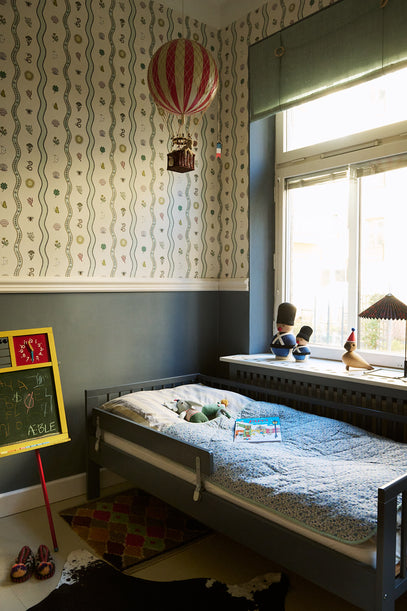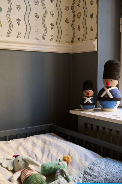 Tapetet er fra det britiske mærke Common Room, og skaber en flot og lys kontrast til den mørkeblå farve, der er brugt på væggen og på sengen.