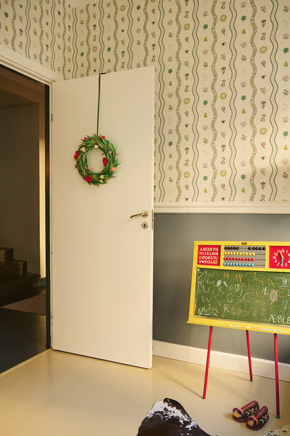 Hele huset inklusiv børneværelserne pyntes op til jul. Men på børneværelserne skal det være praktisk og ikke noget, der kan gå i tusind stykker. Leos mor lavede sidste år denne papirskrans til Leos værelse, og her har den hængt lige siden. Nu er den klar til jul nummer 2.