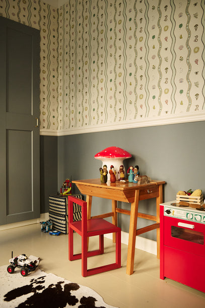 Den røde stol er et nyere køb fra Ferm Living, mens bordet kommer fra Leos mors barndomsværelse. På bordet står et filtet krybbespil og en stor rød svampelampe.