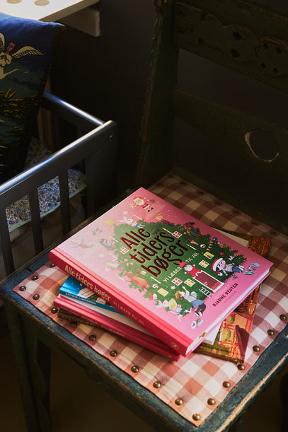 På stolen ligger en stak julebøger fra Gyldendal.