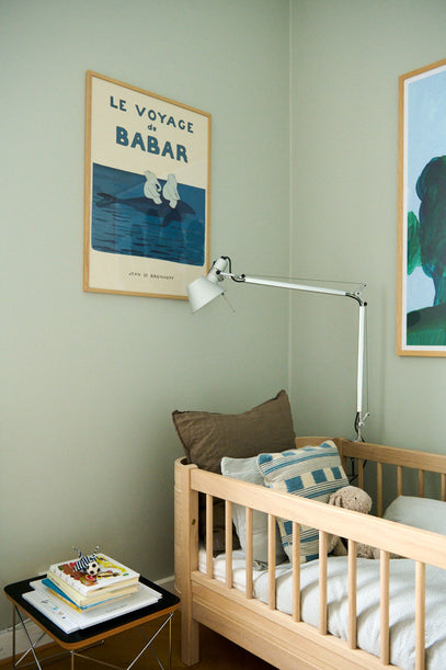 Over sengen hænger 'Le Voyage, Babar' plakaten og en stor version af plakaten 'Elefanterne Gemmer Sig'. Begge plakater er indrammet i egetræsrammer; Babar plakaten i denne ramme.