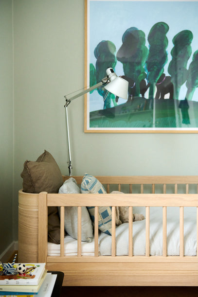 De smukke toner af lys grøn og sart blå passer flot til 'Elefanterne Gemmer Sig' plakaten over sengen. Det smukke egetræ fra Wood Mini juniorsengen giver en dejlig varme og et blødt look til værelset.