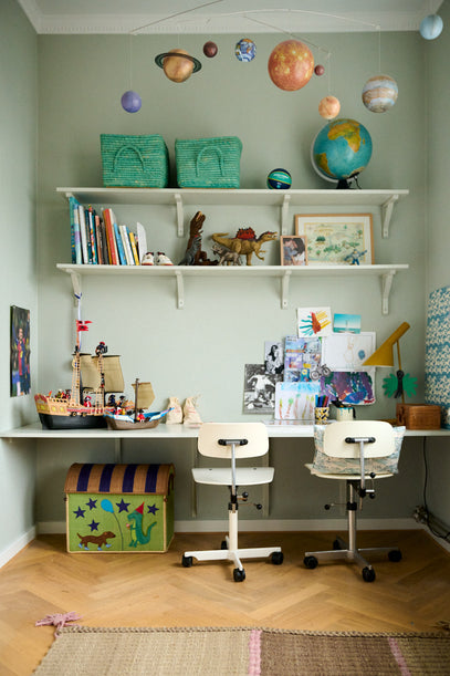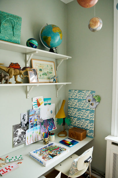 Over bordet er der opsat hylder, som bruges til at opbevare legetøj, bøger, en globus fra Theos' far's barndomsværelse, raffia kurve og en '100 Meter Skoven' plakat.