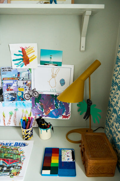 På skrivebordet ses et skønt mix af tegninger, postkort, oldemors gamle rattan smykkeskrin til Theos små skatte, kridt i en praktisk metalboks og den fine bog 'Den Fantastiske Bus'.