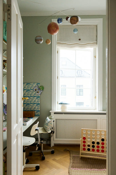 Et kig ind i Theos værelse fra gangen. Her ses en stor planet uro, der hænger fra loftet, det store spil Fire På Stribe, som Theo og hans lillebror tager med ud i haven om sommeren.