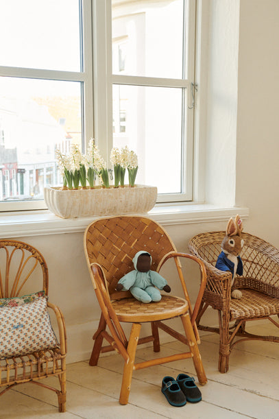 Tre små vintage stole står i stuen og kommer alle fra Vincents mors barndomshjem. I den ene stol sidder en stor blød dukke i farven mint, i den anden en Peter Kanin dukke, og i den tredje et par puder fra Caramel.