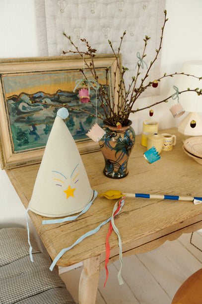 På et bord i stuen, ved siden af et smukt pyntet fastelavnsris, ligger en troldmandshat og tilhørende tryllestav klar til Fastelavn.