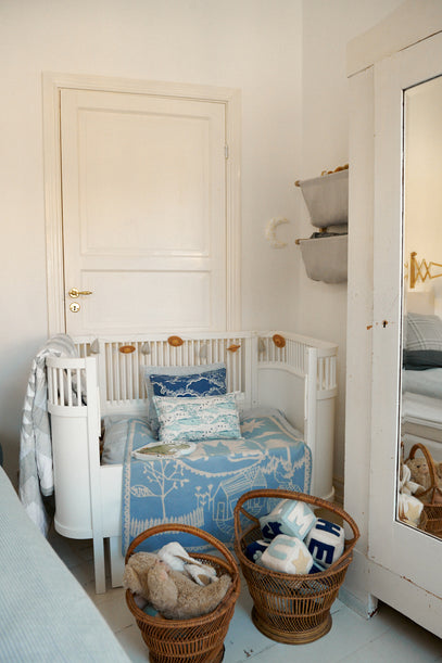 Vincents seng står i forældrenes soveværelse ved siden af deres seng. Hans område er fint markeret i blå farver fra både sengetæppet og den lille pude ovenpå sengen, syet i Liberty stof. Kurvene på gulvet er vintage og fyldt med bamser og blødt legetøj.