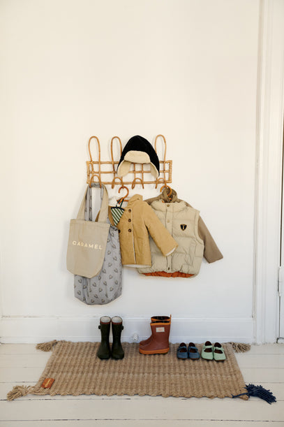 I gangen hænger en fin rattanknage så lavt, at Vincent selv kan nå både jakker og hue. Her hænger også et net fra Caramel, og under står små søde sko fra PéPé og praktiske gummistøvler.