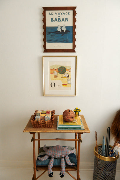 Små 'installationer' ses rundt omkring i lejligheden. Her er det et gammelt vintage rattanbord der er i centrum. Bordet bruges til opbevaring af nogle af Vincents bøger, en pindsvine-sparegris i ler, som Vincent har fået af sin mormor, og nogle vintage træklodser. Over bordet hænger 2 Babar plakater i smukke rammer.
