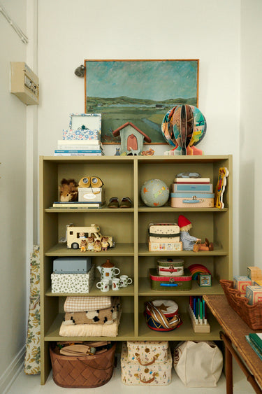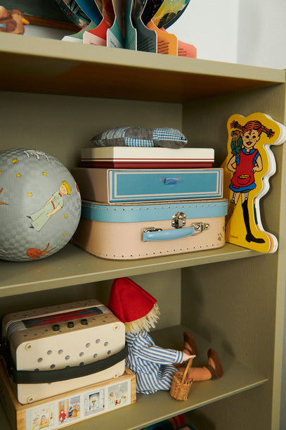 I den anden ende af værelset står en gammel reol, malet i farven "Old Yellow Bloke" fra File under Pop. Her opbevares dukker, puslespil, en bold, figurbogen om Pippi Langstrømpe, og flere små kufferter, der bruges til opbevaring af mindre legetøj. Se lignende kufferter her.