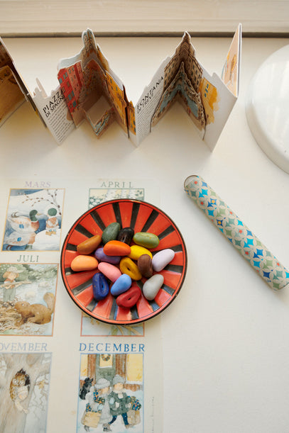 På bordet ligger de farverige rock crayons oliekridt kridt på en smuk tallerken. Ved siden af ligger et kaleidoskop der er sjovt at kigge i, og under det hele; en ældre Elsa Beskow dækkeserviet til at skåne bordet mod tuscher og lim og andet godt når der tegnes.