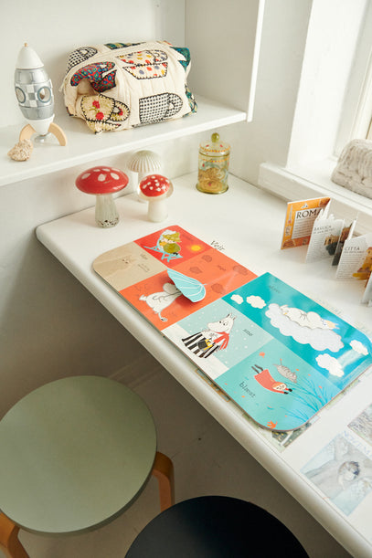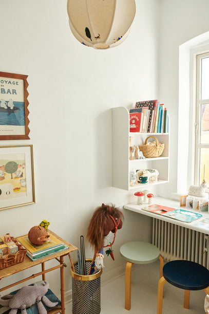 En flapbog med Mumi fra Gyldendal ligger på bordet ved siden af tre vintage svampe i keramik og en glas bonbonnière fra Akua. En toilettaske fra Sea New York står på hylden.